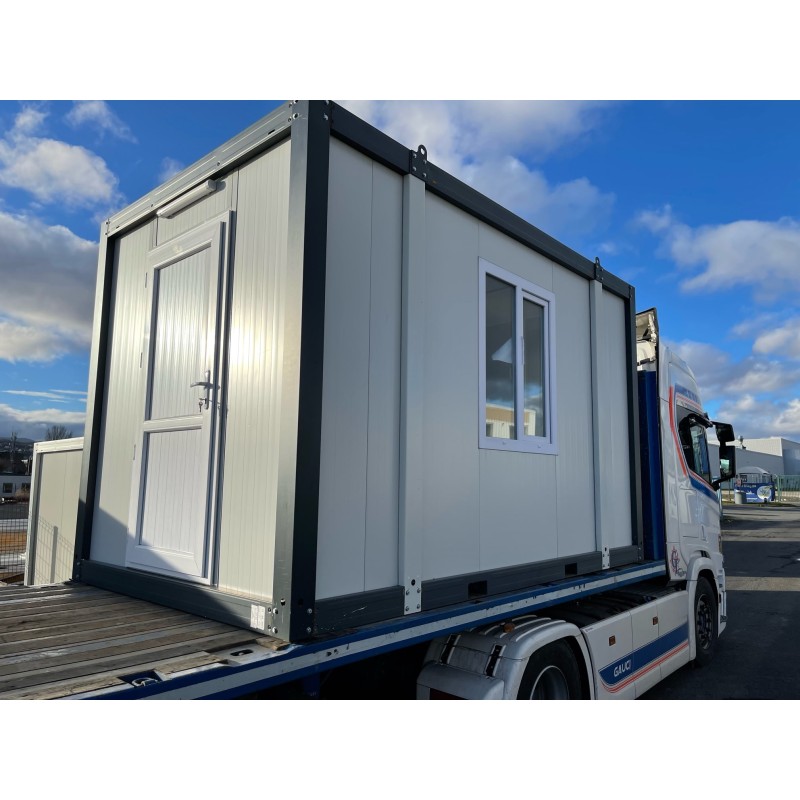 Contenedor oficina versátil 6x3m con aislamiento sándwich y climatización.