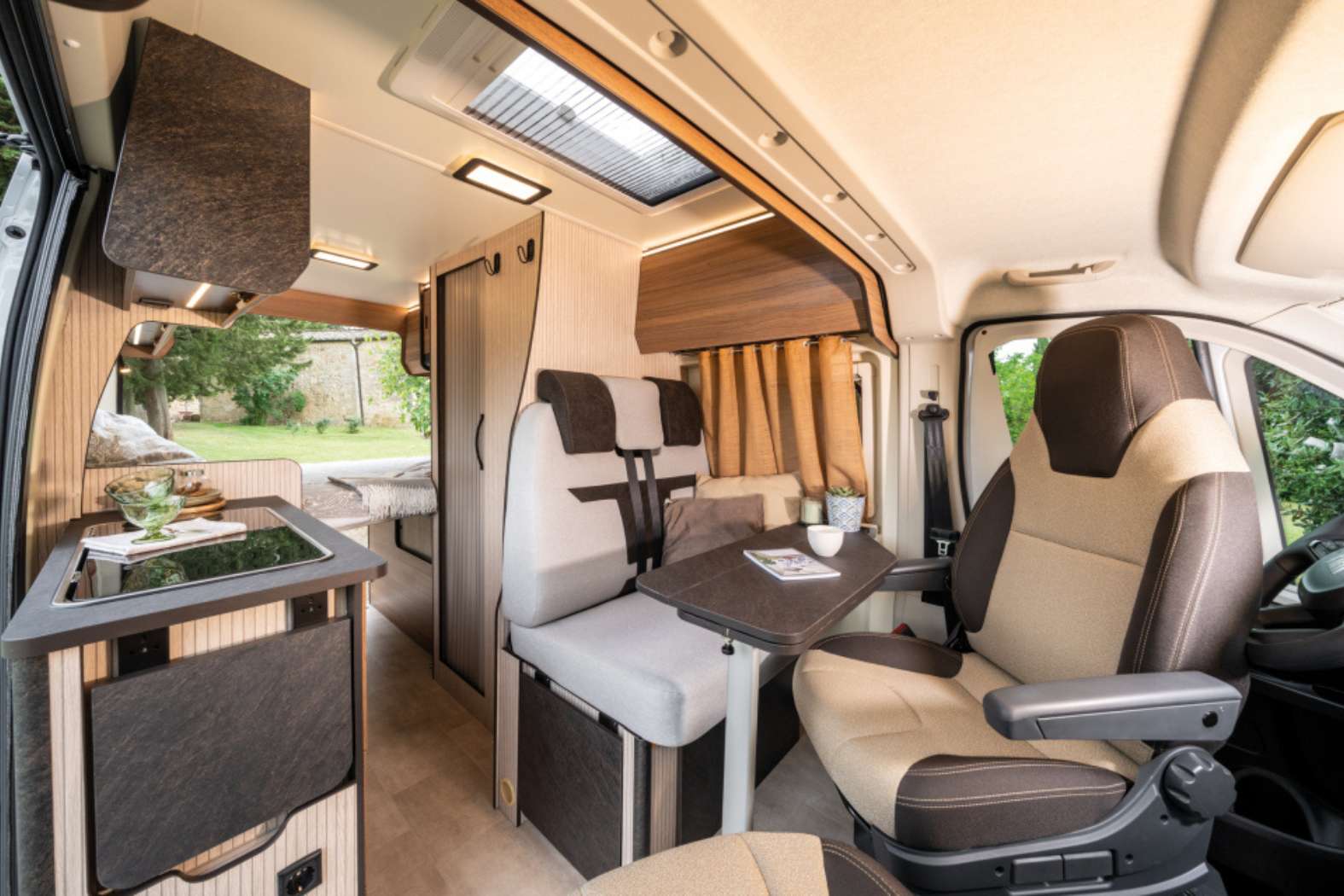 Horus 54 perfilada 5,41m con cama fija matrimonio 132x192cm, asientos giratorios cabina, cocina 2 fogones/nevera 70L, calefacción+agua caliente gas y oscurecedor cabina para máxima autonomía.