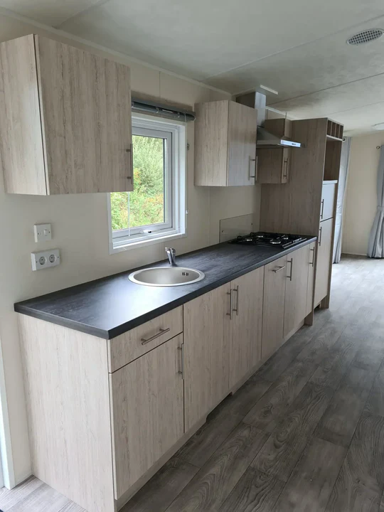 La Casa móvel T2 Agla ofrece 38,5 m² perfectamente distribuidos en dimensiones compactas de 1000 x 385 cm, diseñada para máxima eficiencia en parcelas de tamaño medio con aislamiento integral que garantiza confort climático durante todo el año. Sus 2 dormitorios completamente equipados alojan 4 personas cómodamente mediante configuración cama doble + 2 individuales o literas, creando versatilidad para parejas con hijos o grupos pequeños.​