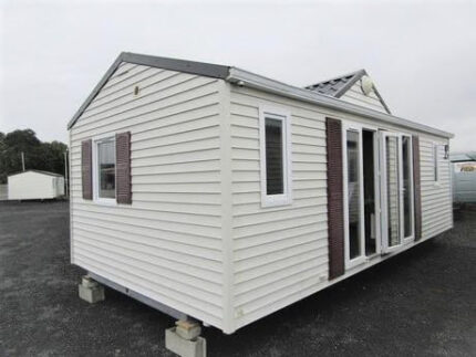 La casa móvil está pensada para instalarse en campings, parques residenciales o parcelas privadas, con acceso mediante una pequeña escalera frontal. Su estructura modular facilita el transporte y el montaje, permitiendo una puesta en servicio rápida y con pocos trabajos de obra.