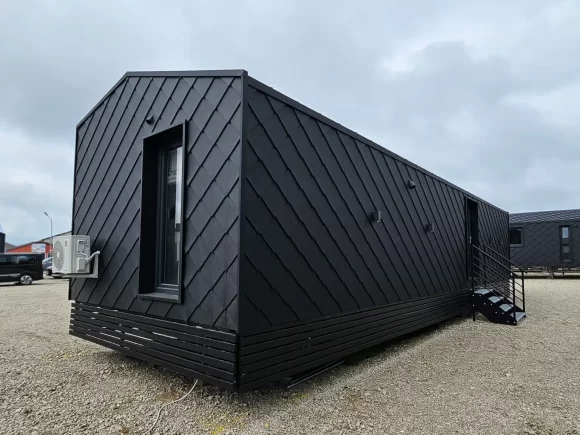 La fachada en piedra negra premium combinada con generosas ventanas estratégicas crea un diseño arquitectónico moderno que eleva cualquier camping 5* o parque residencial. Esta casa diminuta lista para habitar reduce drásticamente los tiempos de instalación y permite generar ingresos inmediatos en temporada alta.​