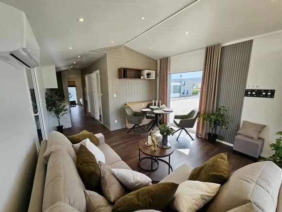 La Casa Móvil JB Piedra Negra XL redefine el concepto de vivienda compacta de alta gama con sus 57,2 m² totales (40,3 m² habitables) y dimensiones optimizadas de 13,30 x 4,30 m, perfecta para residencia permanente, segunda vivienda o alquiler vacacional exclusivo. Su espectacular terraza integrada con iluminación LED permite disfrutar del exterior protegido, conectando visualmente con el amplio ventanal frontal que inunda de luz natural todo el espacio interior.​