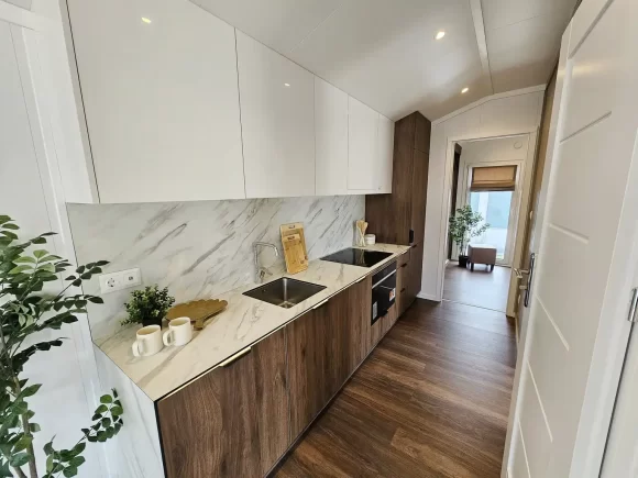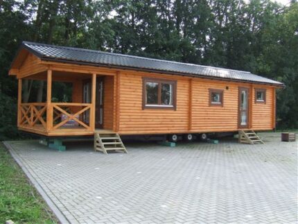 Casa móvil de madera 45 m² nueva 10x4,5m con porche convertible.