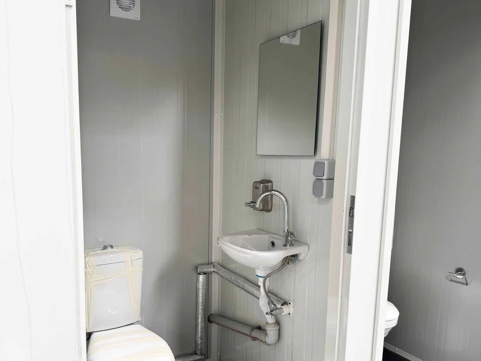 Cada habitación incluye inodoro con lavabo, espejo sin marco moderno, portarrollos y dispensador jabón metálicos de alta durabilidad, más ventilación independiente que evita condensaciones en uso intensivo. La chapa galvanizada 2mm con fachadas RAL 9002/marcos RAL 7016 ofrece estética profesional discreta, personalizable según proyecto específico.