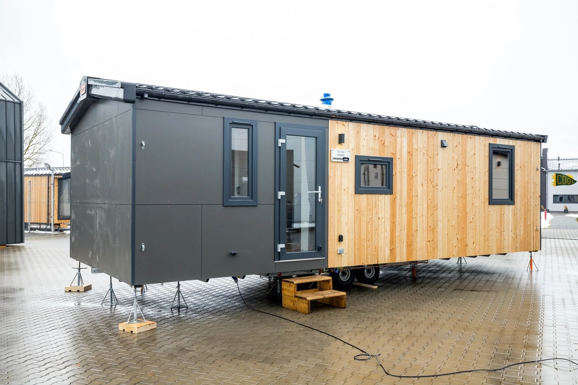 Casa móvil Shadow moderna con revestimiento madera 3 ventanas y porche.