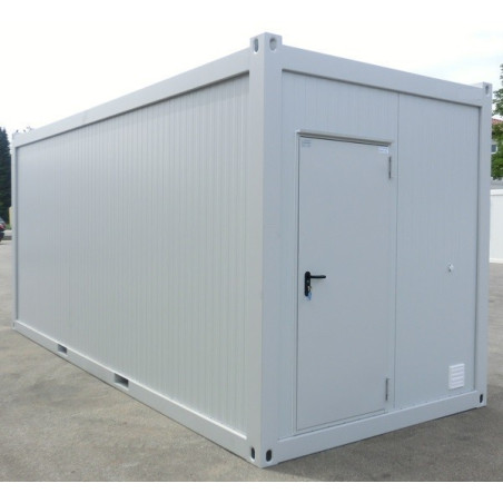 Contenedor marítimo de 20 pies transformado en módulo habitable, nuevo y listo para usar. Equipado con 2 ventanas de PVC oscilobatientes con persianas y 1 puerta de acero. Cuenta con aislamiento térmico, instalación eléctrica completa (iluminación LED, tomas de corriente) y convector eléctrico para calefacción. Ideal para oficinas de obra, almacén con confort, taller, vestuario o espacio auxiliar. Fácil de transportar e instalar.