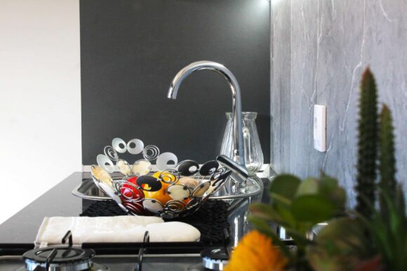 Cocina abierta: microondas, extractor, cocina gas, nevera, fregadero, azulejos porcelánicos