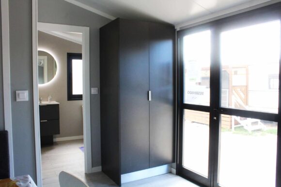 La habitación principal incluye cama matrimonial, 2 mesitas con luces integradas y armario corredera, mientras la segunda habitación ofrece 2 camas individuales, mesita y armario independiente. El baño completo incorpora WC, lavabo con espejo, ducha hermética, toallero y estantería, todo en acabados premium. Disponible en fachadas blanco, gris o imitación madera para personalizar según entorno.