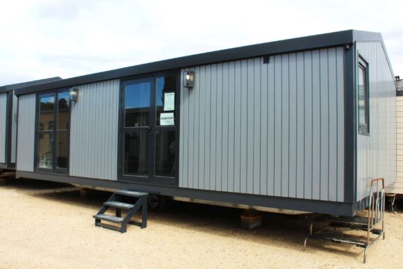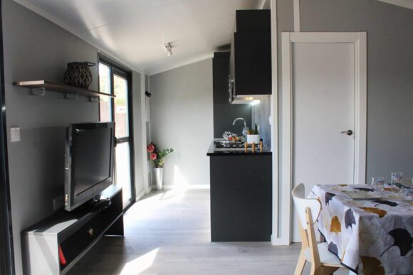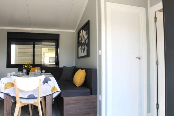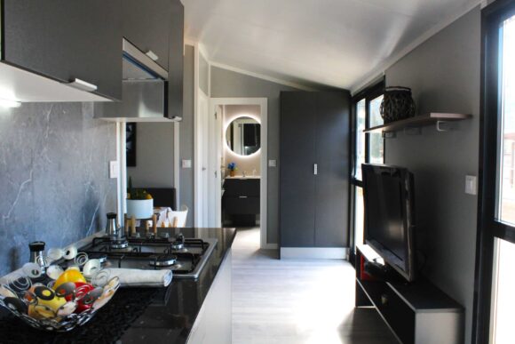 Mobil home Cuni 2-H VIMBODÍ de alta gama con chapa galvanizada sin mantenimiento, aislamiento térmico premium, salón luminoso en L, cocina completa abierta y 2 dormitorios equipados, ideal para camping o parcela privada.