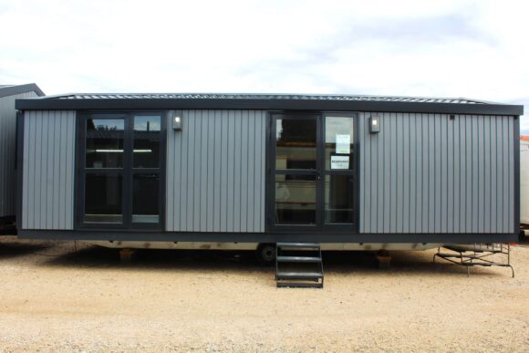 El Mobil Home Gama Alta Cuni 2-H Modelo VIMBODÍ ofrece máximo confort vacacional con estructura exterior en chapa galvanizada prelacada reforzada con ángulos de aluminio y ruedas de alta resistencia, eliminando necesidades de mantenimiento. Ventanas negro antracita con persianas y estores enrollables maximizan luz natural y privacidad, mientras el aislamiento superior en suelos de parquet, vigas de techo térmicas y paredes gruesas garantiza habitabilidad 10 meses al año.