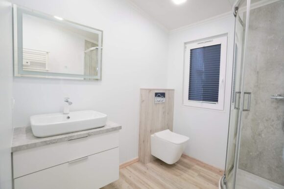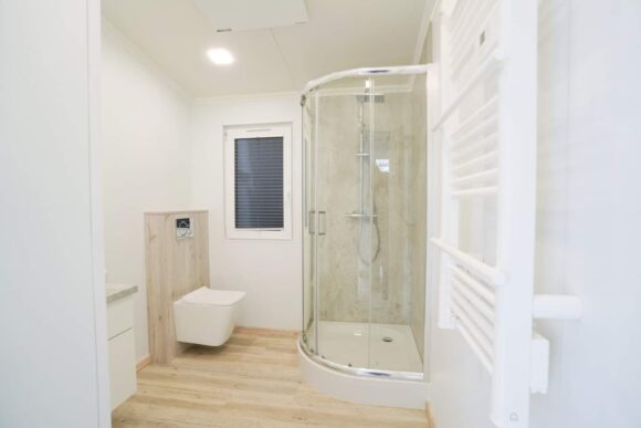 Mobil home VTT XL de alta gama con triple acristalamiento en todas las ventanas, cocina americana equipada con placa inducción, lavavajillas y horno, 2 dormitorios premium y baño completo con ducha 120×80 cm.