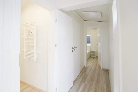 El dormitorio principal incorpora cama de matrimonio 160×200 con colchón premium, armario empotrado y dos mesitas de noche, mientras el dormitorio adicional ofrece dos camas individuales con mesitas correspondientes. El baño totalmente equipado cuenta con cabina de ducha generosa 120×80 cm, inodoro suspendido con placa de cierre lento y mueble completo con espejo y lavabo. Los pisos de vinilo resistentes y las láminas de fachada completan un diseño moderno y duradero.
